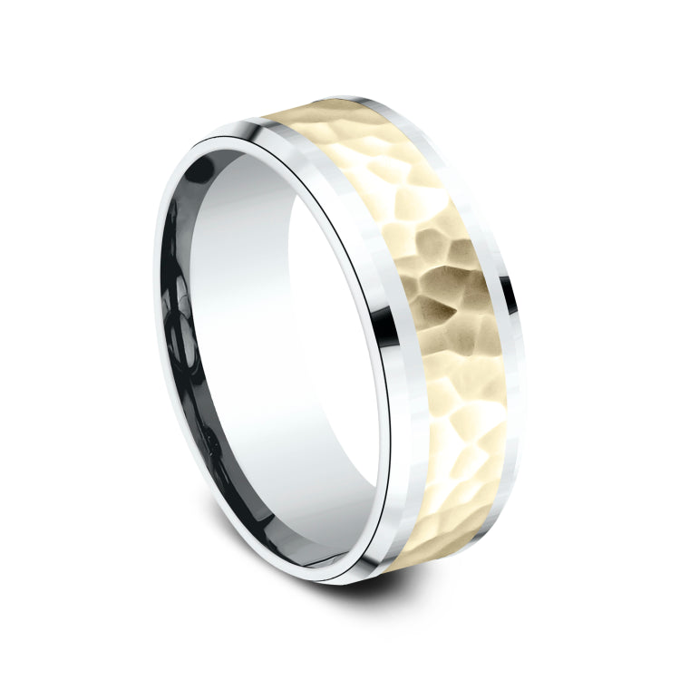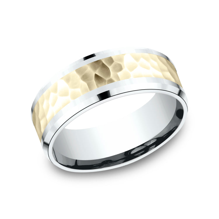8mm, Comfort fit14K White and Yellow GoldHammered center, polished bevel edges