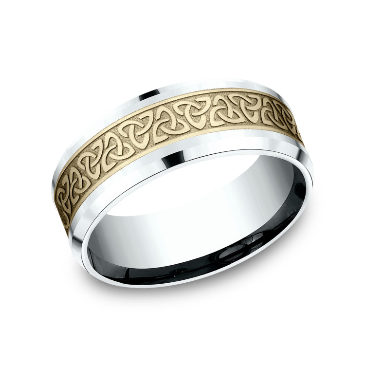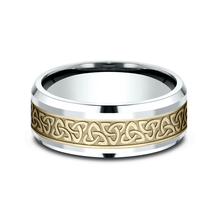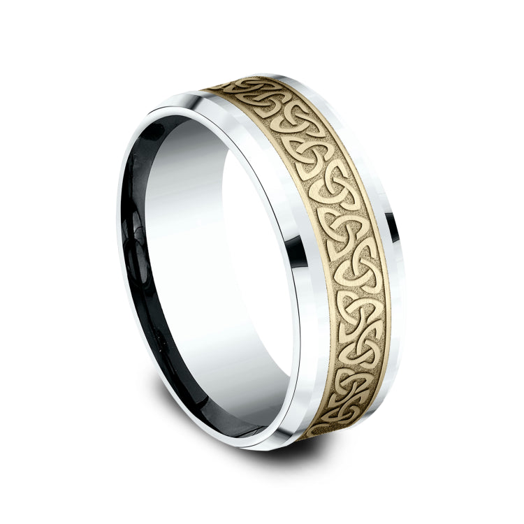 8mm, Comfort fit14K White and Yellow GoldCeltic knot pattern, polished drop bevel edges