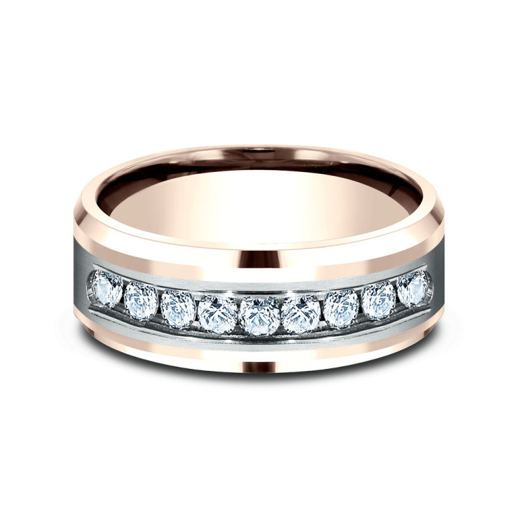 8mm, Comfort fit14K Rose and White GoldSatin center, polished bevel edges9 channel set diamondsCarat weight is .72ctClarity SI1-2, Color GH