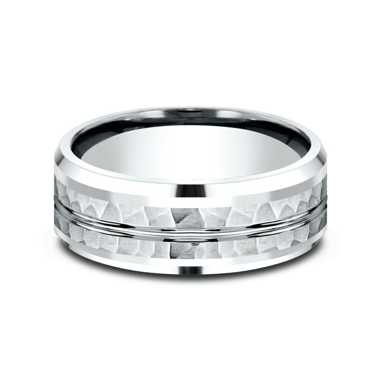 8mm, Comfort fit14K White GoldHammered finish, polished center cut and drop bevel edges