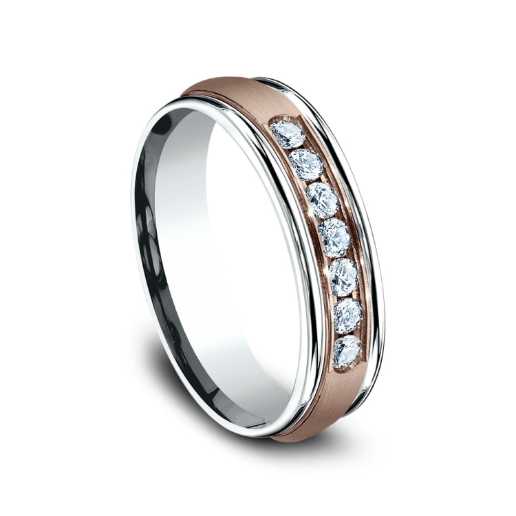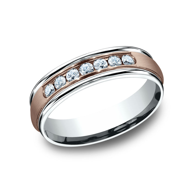 6mm, Comfort fit14K White and Rose GoldSatin center, polished round edges7 channel set diamondsCarat weight is .42ctClarity SI1-2, Color GH