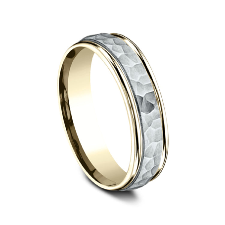6mm, Comfort fit14K Yellow and White GoldHammered center, polished round edges