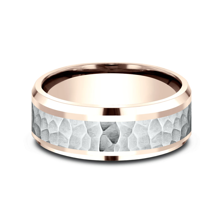 8mm, Comfort fit14K Rose and White GoldHammered center, polished bevel edges