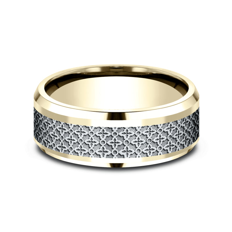 8mm, Comfort fit14K Yellow and White GoldOttoman floral pattern, polished bevel edges