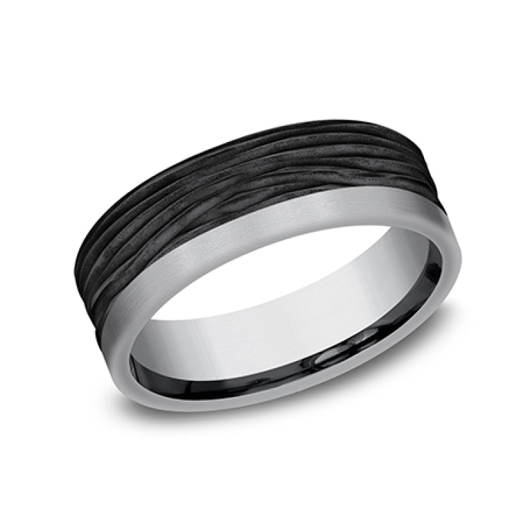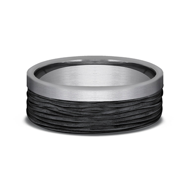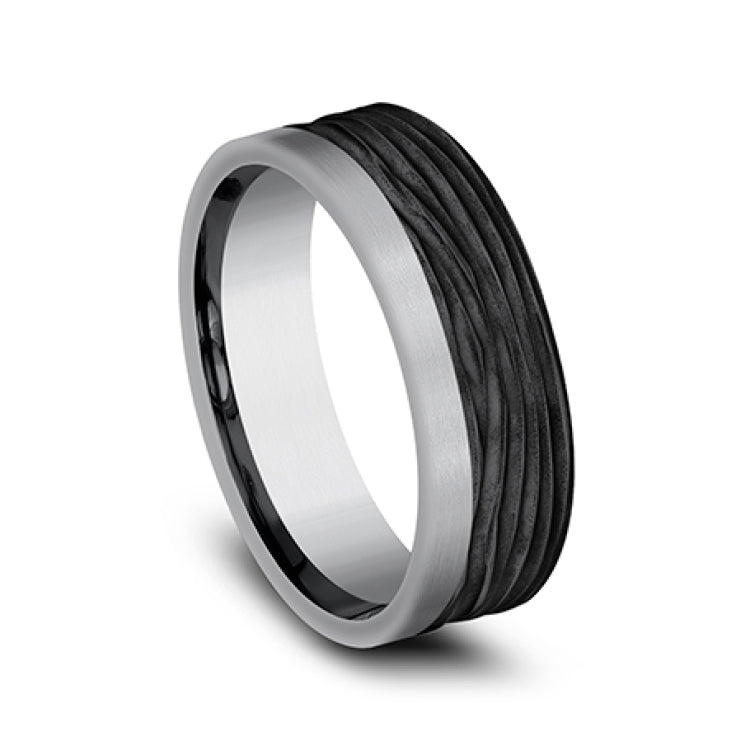 7mm, Comfort fitGrey Tantalum and Black TitaniumHorizontal bark pattern, one satin edge