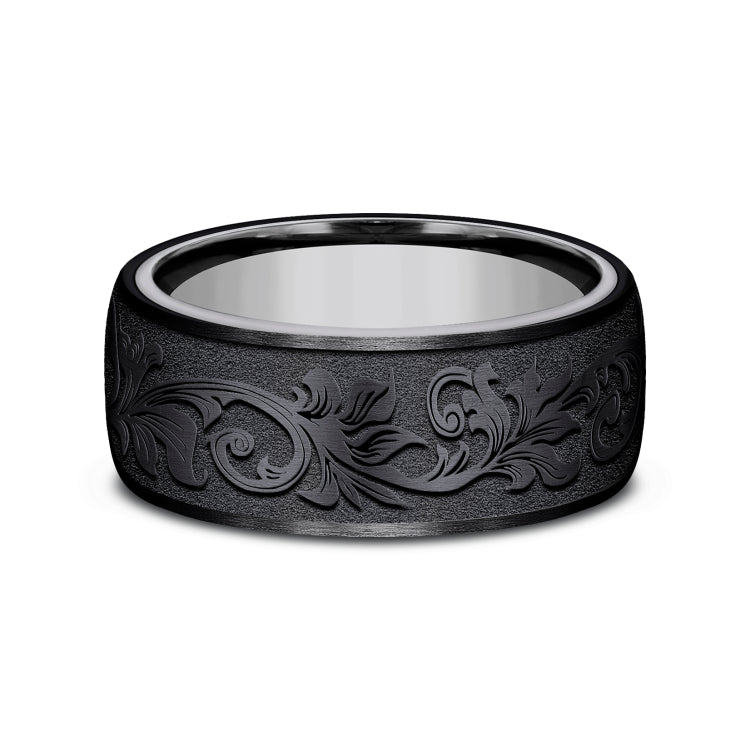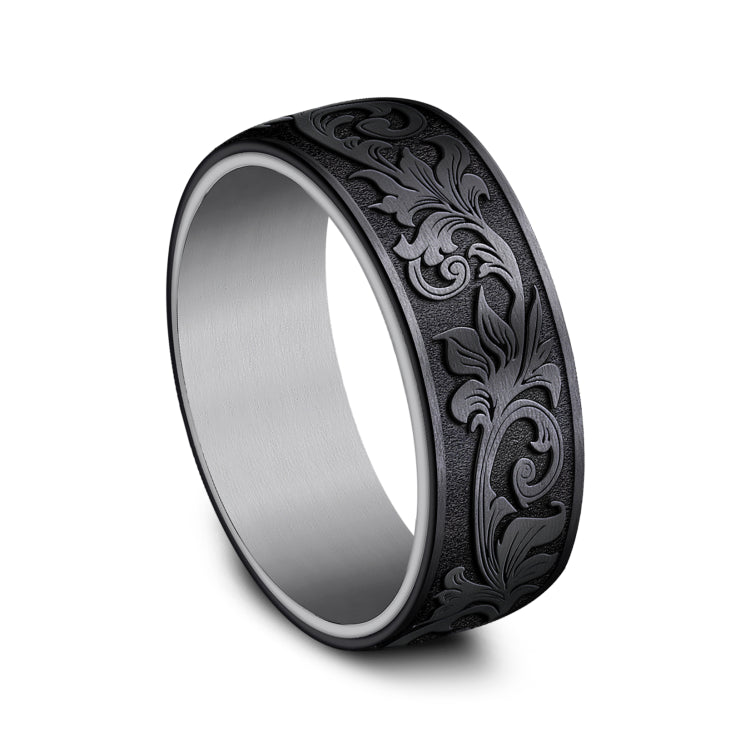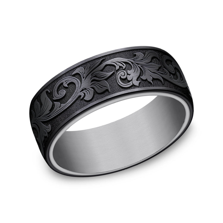 8mm, Comfort fitGrey Tantalum and Black TitaniumVintage script pattern, straight edges