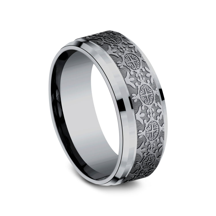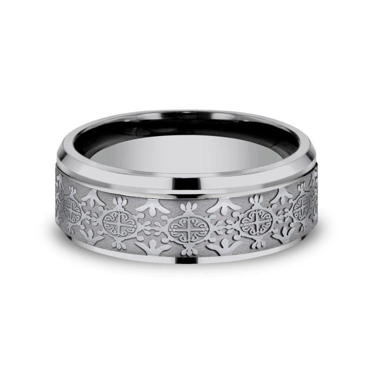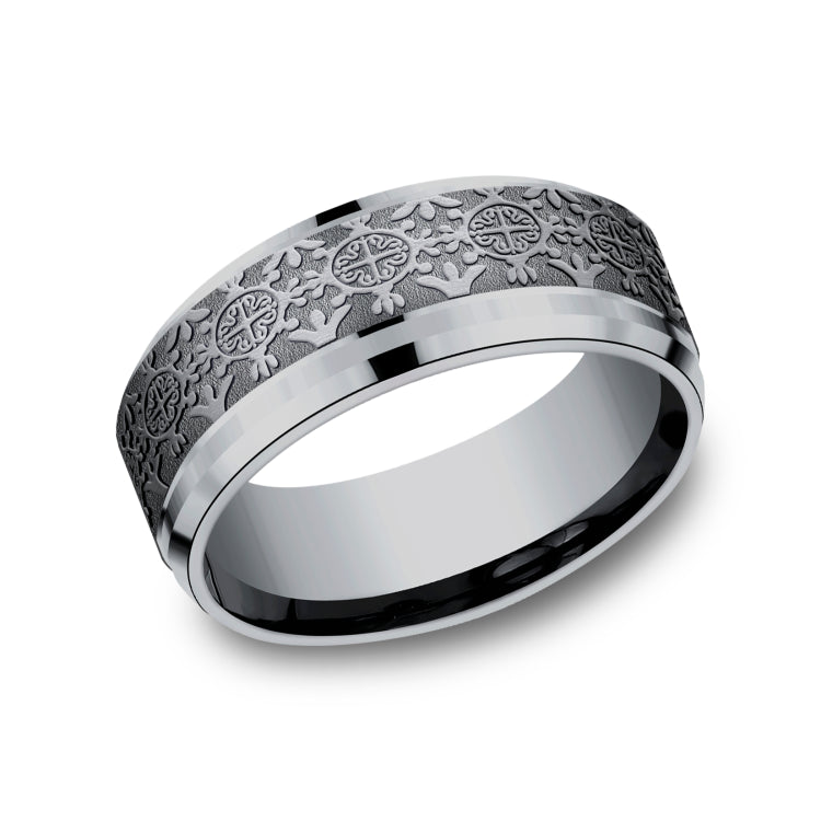 8mm, Comfort fitGrey TantalumIntricate patterned center, polished bevel edges