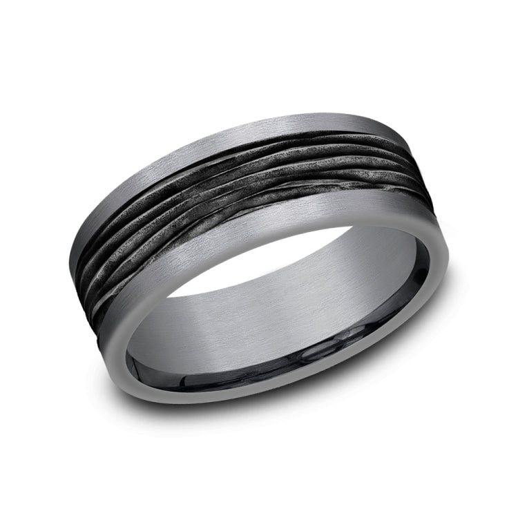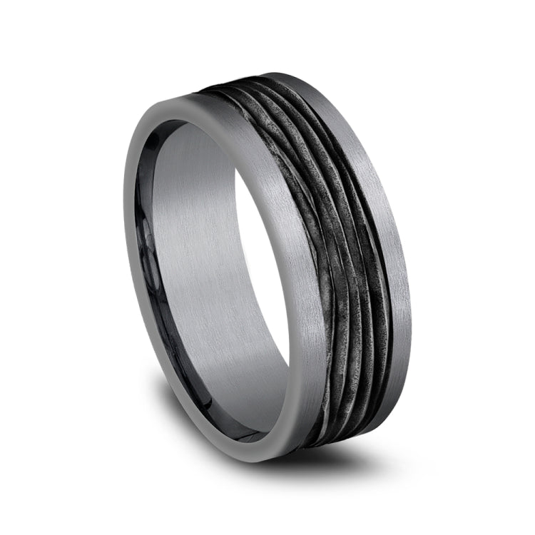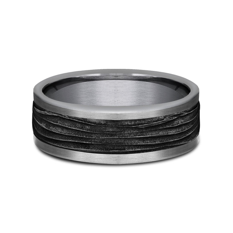 8mm, Comfort fitGrey Tantalum and Black TitaniumHorizontal bark patterned center, straight edges