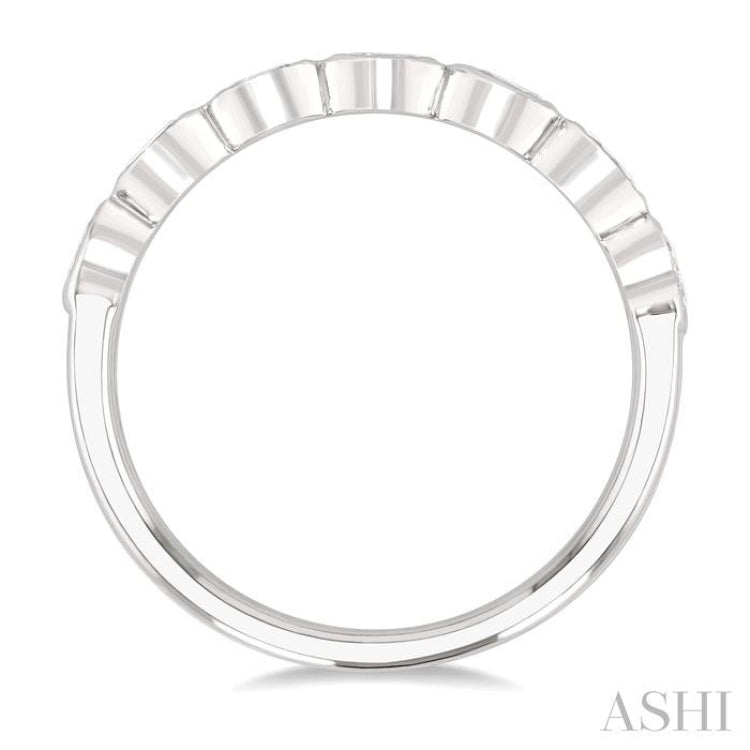 Stackable bands are designed to be worn with other stack bands, to add volume and beauty. They are basically sleek, delicate rings in different designs that are mixed and matched as per the wearer's choice. Every woman has a couple stackable bands in her jewelry case. This is another beautiful stack band to add to that collection. It features a row of east-west set diamonds, lining the ring top. There is a total of 7 bezel set 1/10 Ctw oval cut diamonds embellishing the band. The stackable bezel diamond fashion band is carved in a rhodium finish 14 karat white gold. The total diamond weight is 3/4 Ctw.