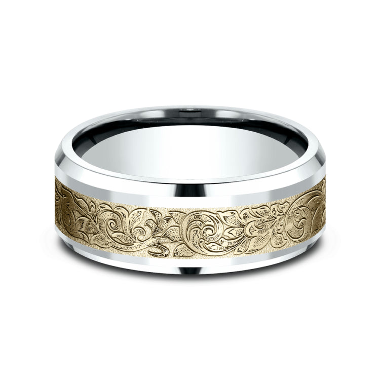 8mm, Comfort fit14K White and Yellow GoldLondon script patterned center, polished bevel edges