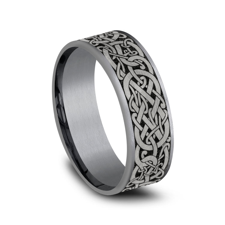 7.5mm, Comfort fitGrey Tantalum and Grey/Black TitaniumViking knot patterened center, thin edges