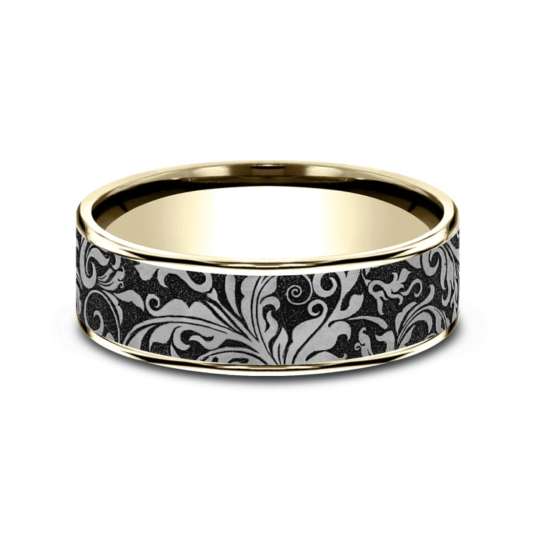 7.5mm, Comfort fit14K Yellow Gold and Grey/Black TitaniumLeaf script pattern, thin edges