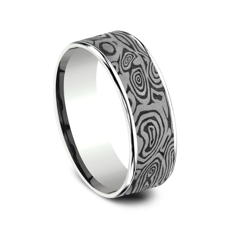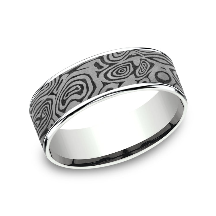 7.5mm, Comfort fit14K White Gold and Grey TantalumUnique Tamascus designed center, thin edges